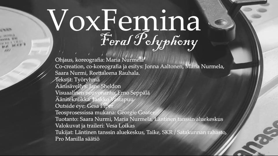 VoxFemina premiered in September 2020 at the Manifesti Theatre Festival in Turku, and was part of the 40th International Festival de Dance Contemporanea Lila Lopez (San Luis Potosí, Mexico), with a half an hour documentary film about the multidisciplinary working methods and the process of making the performance. The documentary was premiered in July 2020 at the Festival in San Luis Potosí.